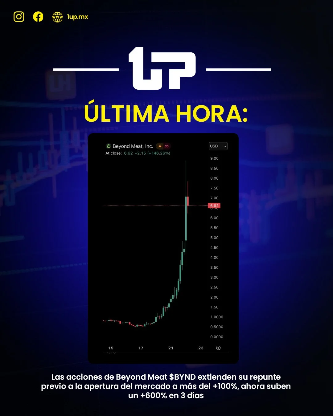 Las acciones de Beyond Meat ($BYND) continúan con un repunte histórico. Antes de la apertura del mercado, los títulos ya acumulaban un aumento superior al +100%, y en apenas tres días han escalado más de +600%.